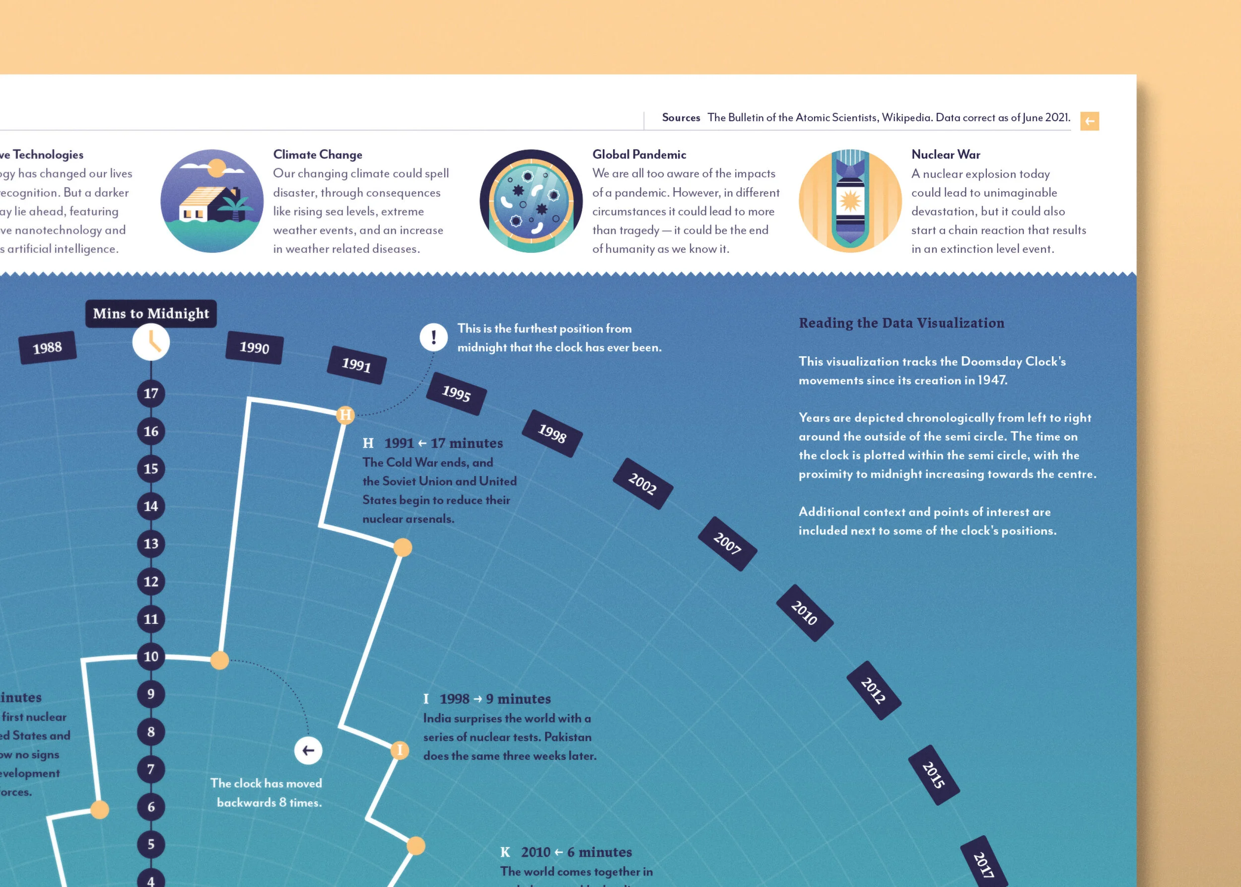 This data visualization tracks the movement of the Doomsday Clock since it's creation, providing context and points of interest through the clock's history, and explores why today the symbol is more important than ever.